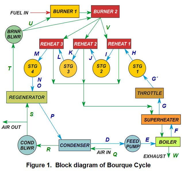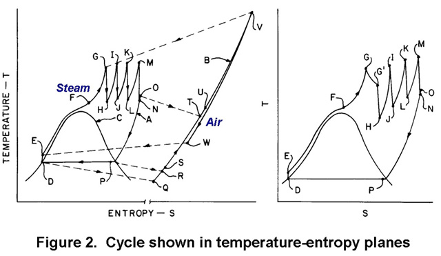 On the air side, seen in green in Figure 1 and on the left side of Figure 2 as an isobar, outside air enters the Condenser at Q and leaves it heated to R. It is drawn through the Condenser Blower heating it slightly to S. It is then substantially heated in the Regenerator by the desuperheating steam to T and slightly more to about 316°C (600°F) by the Burner Blower to U. It then enters the Combustor where adding fuel heats it to its combustion temperature of 1482°C (2700°F) at V. It passes through the Steam Generator and out the exhaust at W.