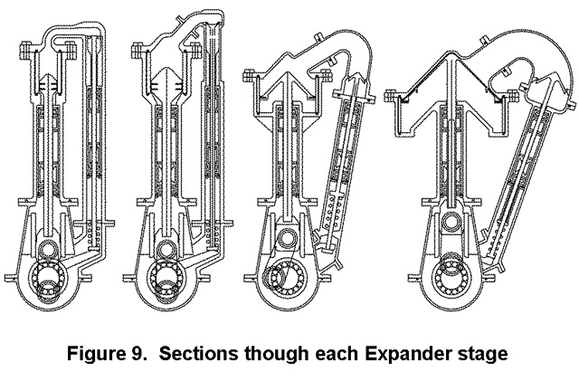 Figure 9 shows transverse cuts through each Expander stage with one of the two valves shown. The sliding crossheads, visible near the bottom, eliminate any side thrust on the piston and piston rods.