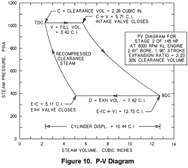 Shown in Figure 9 are the flathead valves and high clearance volumes. The latter would be difficult with high expansion ratios; but pose a minor inconvenience with low ratios. Figure 10 shows, in a P-V diagram, why this is so. Flathead valves eliminate mechanisms and bearings in the hot steam region, which would be difficult to lubricate.