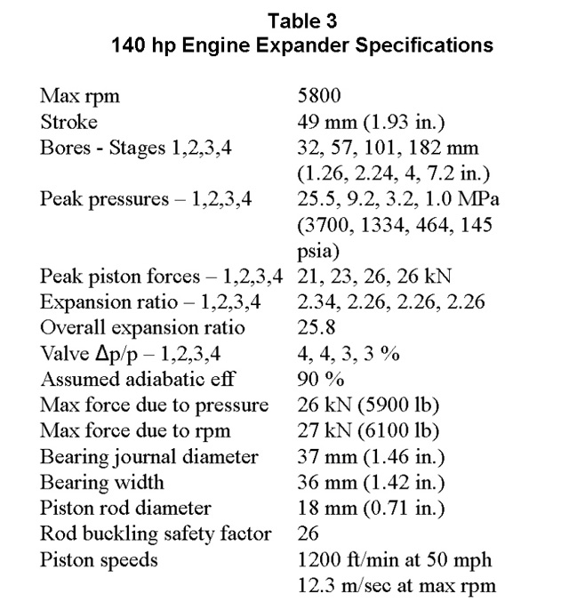 Specifications, reformatted from the code output, are given in Table 3 for the 140 hp Expander. The Expander is discussed in more detail in the following paragraphs.