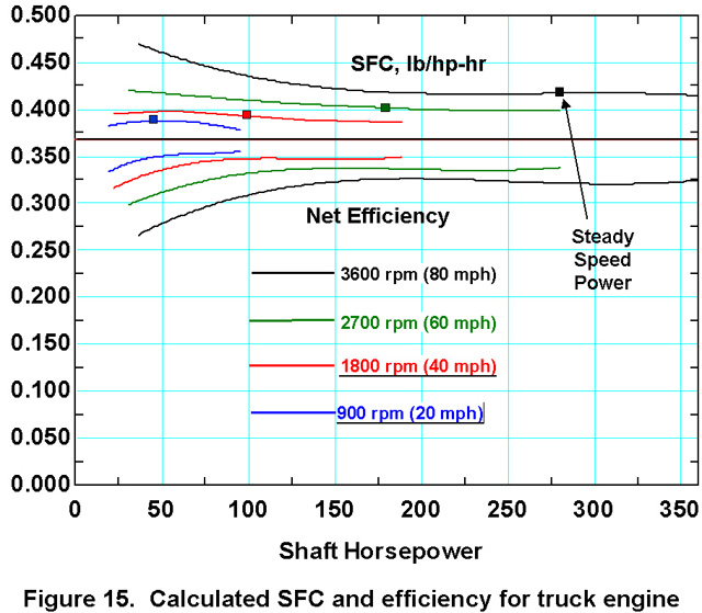 The four points shown in the SFC plots are the steady-speed power values needed for this vehicle and indicate SFC values actually accessed during driving. They come fairly close to modern diesel engines. Calculated fuel economy for this 80,000 lb rig with diesel fuel is a nominal 2.6 km/liter (6 mpg) at 97 km/hour (60 mph), about the same as existing rigs.