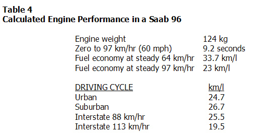 The second example is a 63 kW (85 hp) engine in a Saab 96 (990 kg/2180 lb including fuel and driver). This popular front-wheel drive car, often used in rallies, was built from 1960 to 1980. Its measured CD is 0.32, not far above the best sedans today. Despite the light weight, it had excellent crashworthyness and could carry four full-size adults with luggage. A modern version would be an ideal compact car.